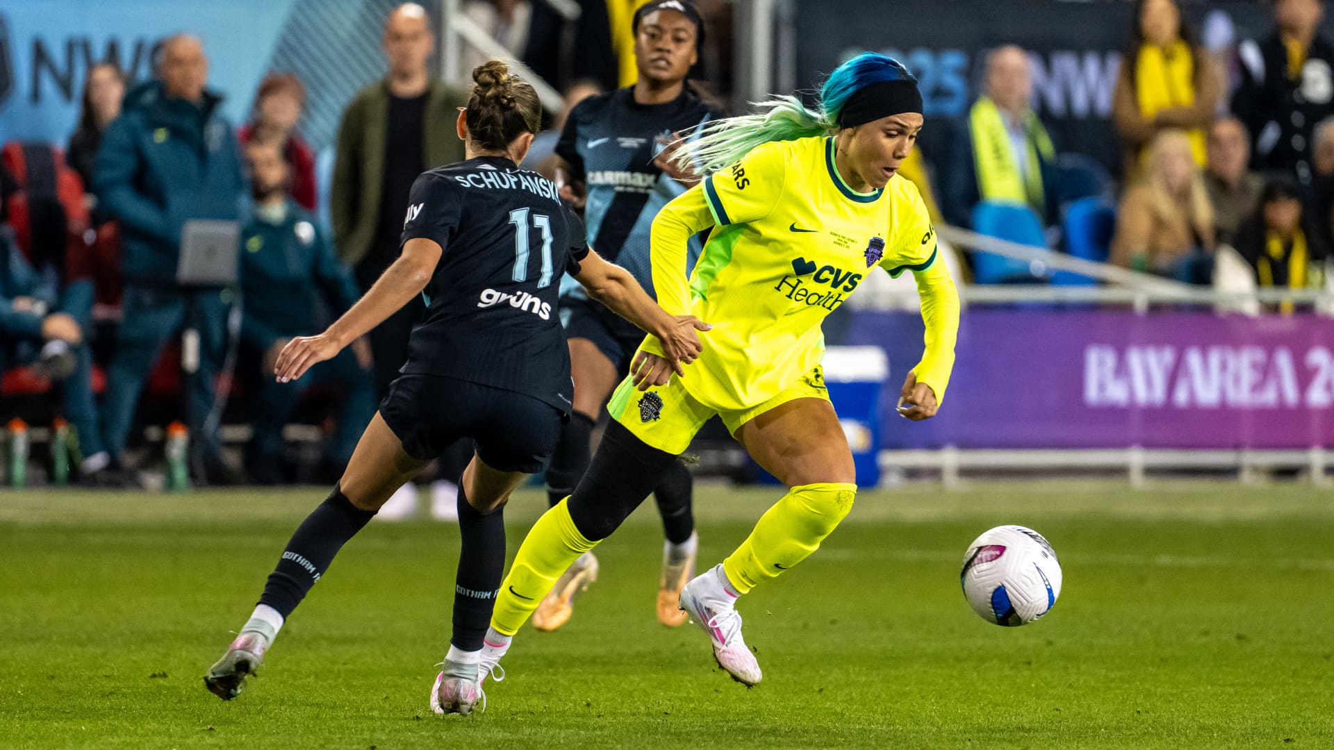 Trinity Rodman #2 of Washington Spirit evades Sarah Schupansky #11 of Gotham FC during the NWSL Championship 2025 final between Washington Spirit and NJ/NY Gotham FC at PayPal Park on November 22, 2025 in San Jose, California.